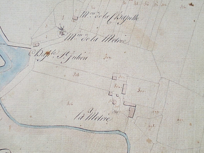 La Métrie sur le cadastre de 1812 : le manoir, la chapelle Saint-Julien et le moulin aujourd'hui détruitsImmatriculation