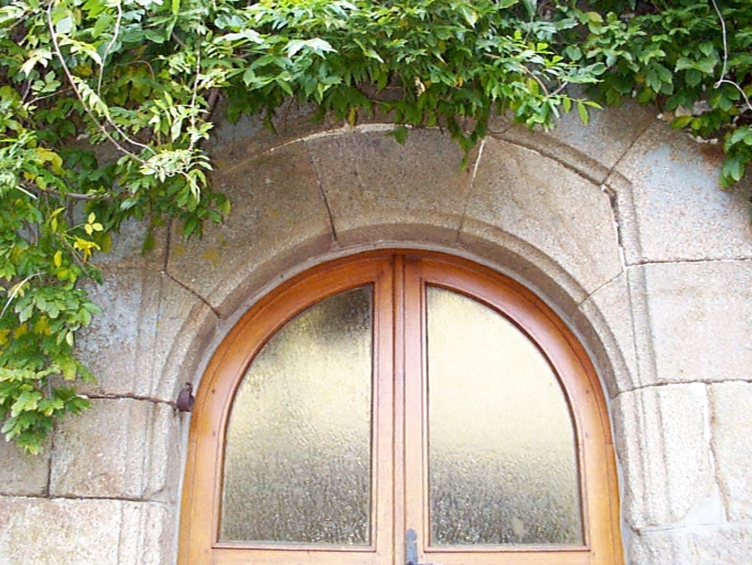 Vue partielle de la porte du logis : arc plein cintre inscrit sous un arc segmentaire et table rentrante ; un décor en forme de cœur est taillé au-dessusImmatriculation
