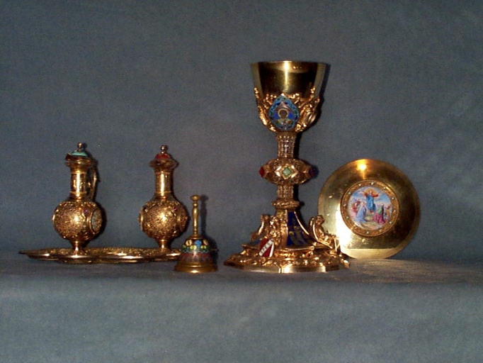 Chapelle : calice, patène, 2 burettes, plateau à burettes, clochette,