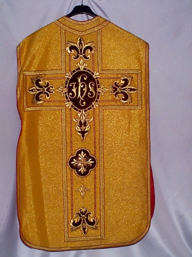 Ornement doré : chasuble, bourse de corporal, étole, voile de calice,