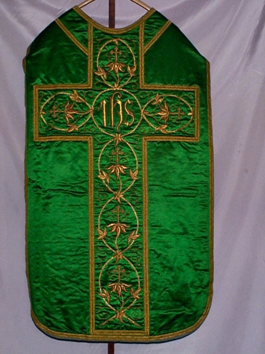 Ornement vert 3 : chasuble, bourse de corporal, manipule, voile de calice,