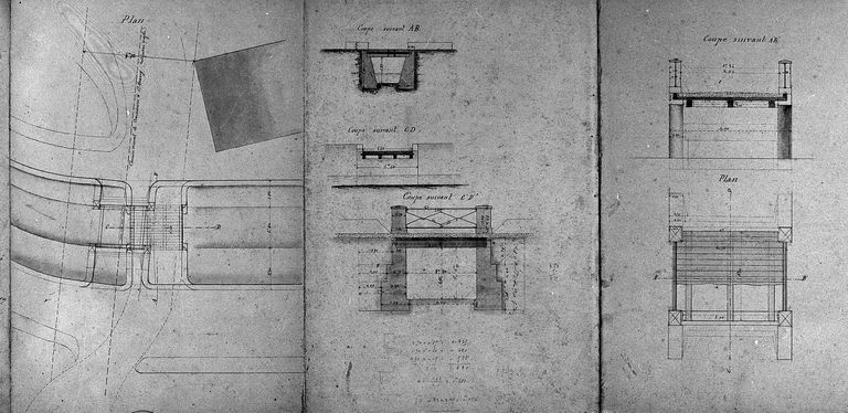 Pont type sur la rigole : plan, coupe transversale et coupe longitudinale. Dessin, [s. n. ; s. d.]. Papier, encre, aquarelle.