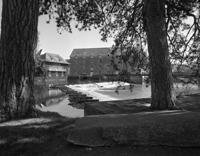 Le déversoir et la minoterie de l'îlot de la Saudraie : vue latérale depuis l'amont (état en 1997)Immatriculation