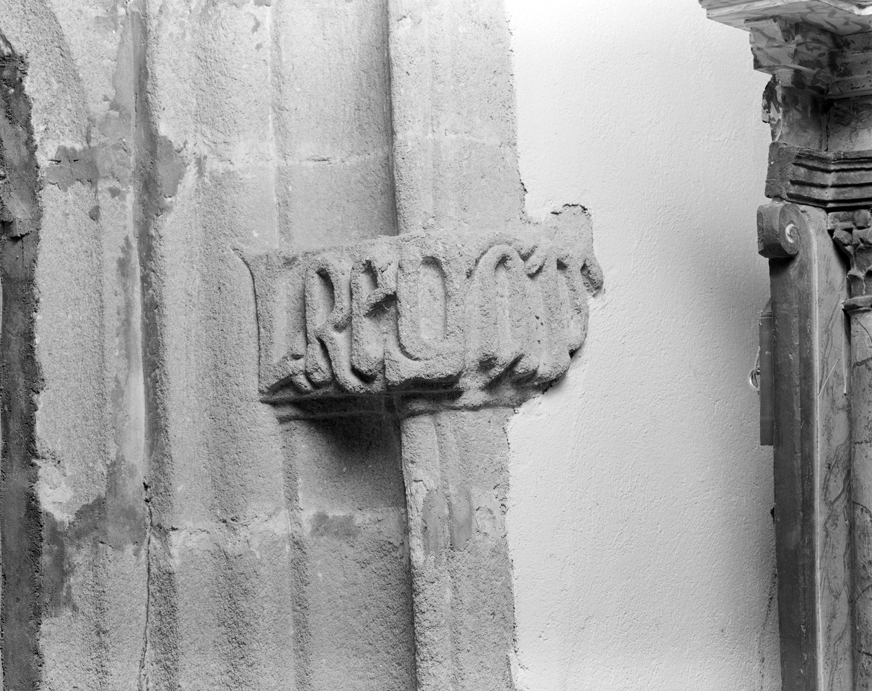Piédroit de la maîtresse-vitre : détail de l'inscription en lettres gothiques.Immatriculation