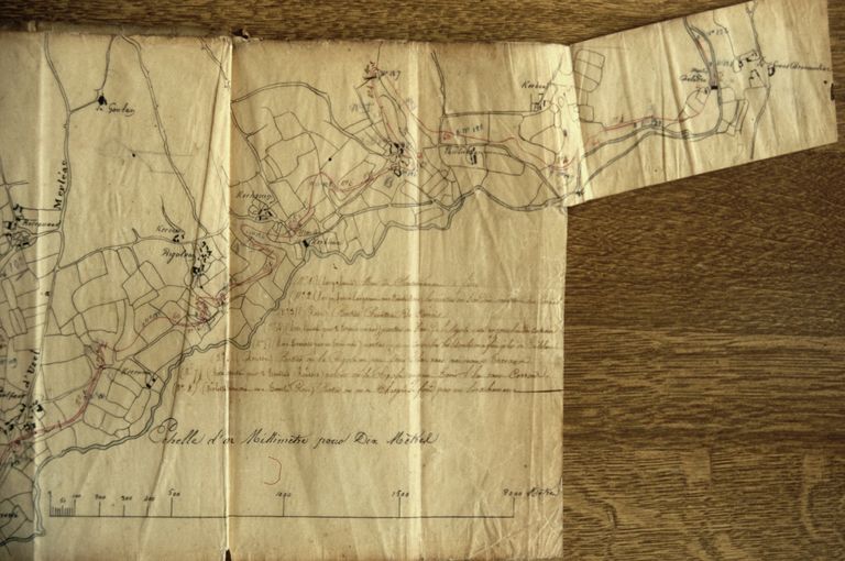 Rigole alimentaire du bief de partage d'Hilvern. Partie comprise entre le ruisseau de Guernay, limite des communes du Quillo et St-Caradec et le ruisseau des Fontaines, limite des départements des Côtes-du-Nord et du Morbihan. Carte [= carte 2], par Faivre, conducteur faisant office d'ingénieur ordinaire des Ponts et chaussées, 22 janvier 1844. Papier, encre.