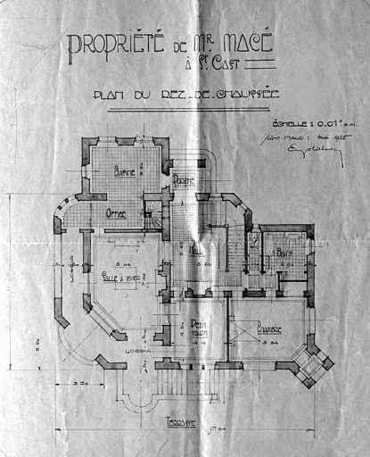 Plan du rez-de-chaussée, par Eugène Olichon, 1925 (A. P.).Immatriculation
