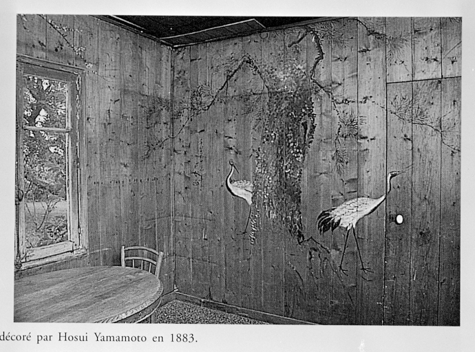 Pavillon logement, vue intérieure, fresque représentant pin et grues.Immatriculation