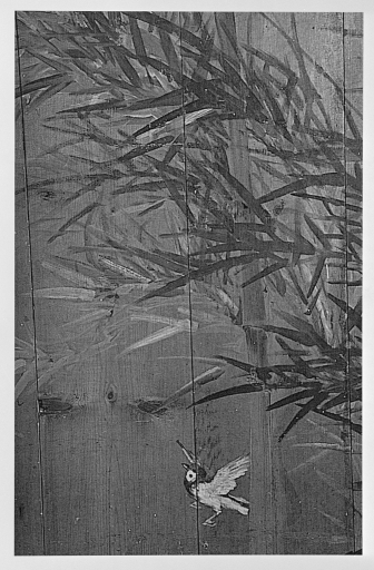 Pavillon logement, vue intérieure, fresque et détail d'oiseau exotique.Immatriculation