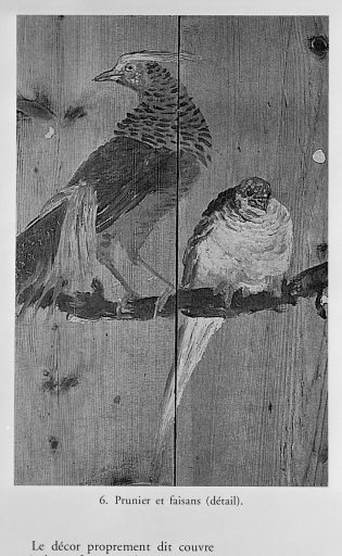 Pavillon logement, vue intérieure, fresque et détail prunier et faisans.Immatriculation