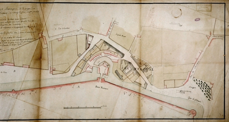 Plan des baraques de la Grippe, des Portes-Blanches et de Toussaints, du champ de foire et de Chicogné, dessin, 18e siècle (A. C. Rennes ; 3 Fi 23)Immatriculation