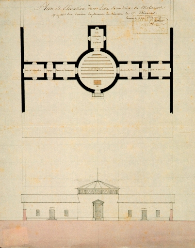Plan et élévation d'une école secondaire de Médecine projetée sur l'ancien emplacement du cimetière de Saint-Etienne, dessin par Gohier, 1821 (A. C. Rennes).Immatriculation