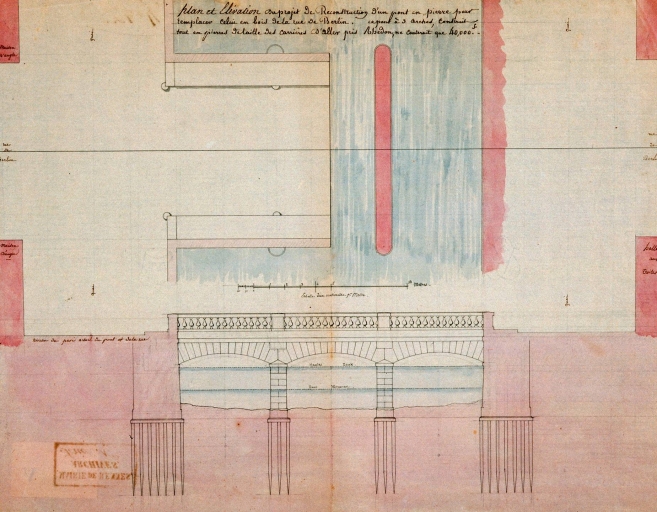Plan et élévation du projet de reconstruction d'un pont en pierre pour remplacer celui en bois de la rue de Berlin (A. C. Rennes, 2 Fi 7)Immatriculation