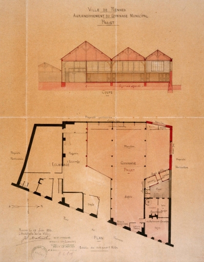 Projet d'agrandissement du gymnase municipal, dessin par Martenot, 1884 (A. C. Rennes).Immatriculation