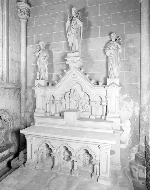 Ensemble de l'autel de Saint-Gilles et Saint-Roch (autel, retable, gradin d'autel, 2 degrés d'autel, bas-relief) : saint Thuriau de Dol bénit un barbare,