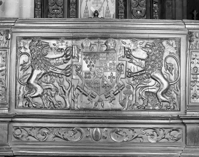 Panneau sculpté portant les armes de Mgr de Laval : vue généraleImmatriculation