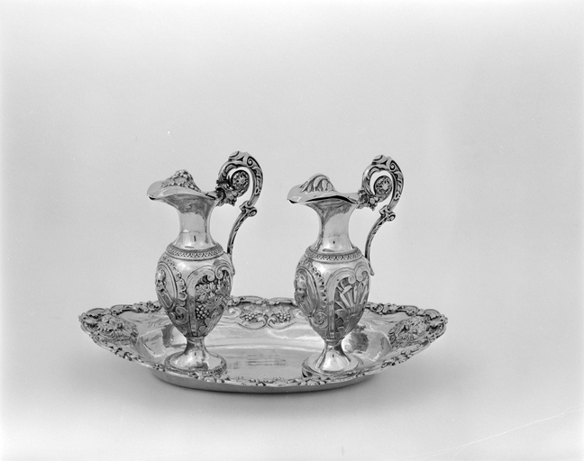 Ensemble de 2 burettes, un plateau à burettes et une clochette,
