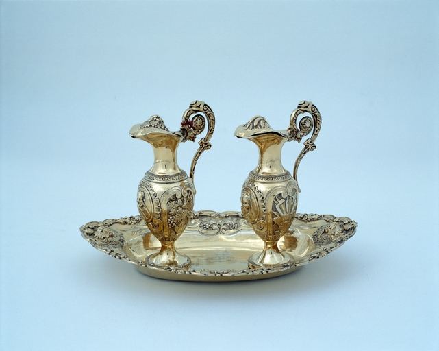 Ensemble de 2 burettes, un plateau à burettes et une clochette,