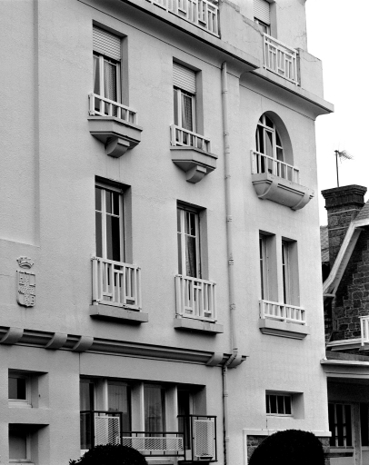 Détail balcon de la façade sur rue de l'hôtel Beauvallon.Immatriculation