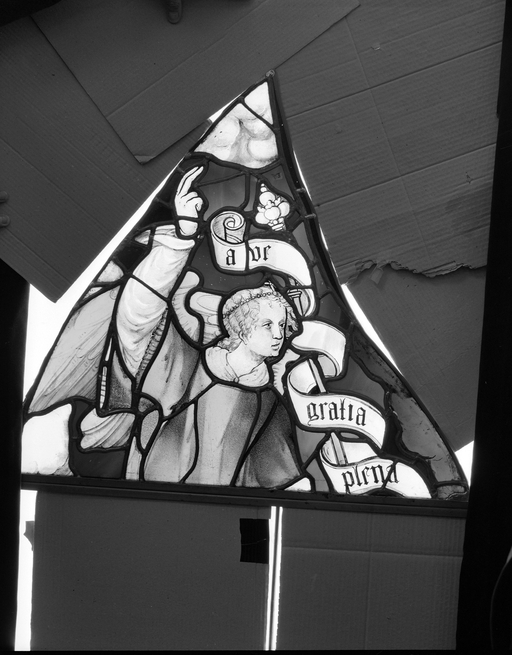 Vitrail en cours de restauration : baie 3 partie haute, Annonciation, détail de la Vierge.Immatriculation