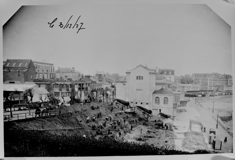 Photographie prise lors du chantier du casino-balnéum, travaux de terrassement, dunes talutées, le 3 décembre 1927.Immatriculation