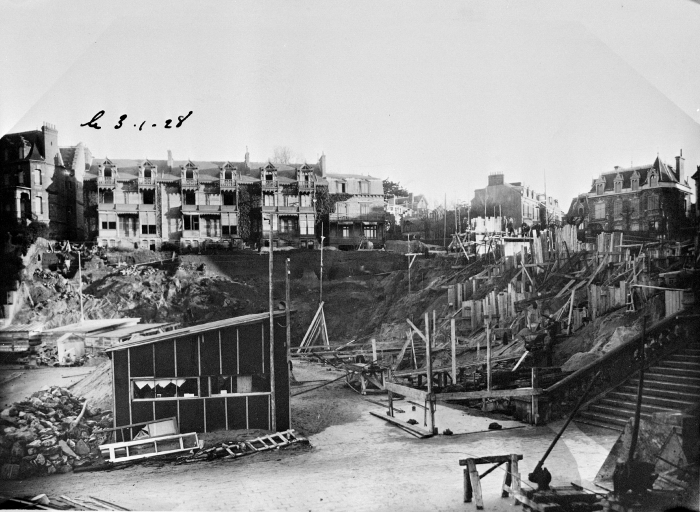 Photographie prise lors du chantier du casino-balnéum, travaux de soutènement suite, 3 janvier 1928.Immatriculation