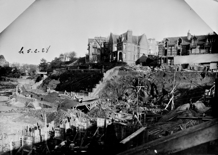 Photographie prise lors du chantier du casino-balnéum, travaux de soutènement avec vue plongeante sur promenade des Alliés, 5 février 1928.Immatriculation