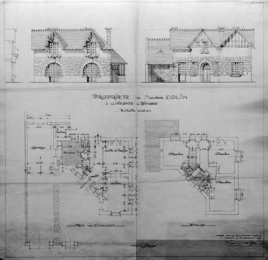 Projet de villa (non numéroté), propriété de M. Colin, élévation postérieure, élévation antérieure, plan du rez-de-chaussée, plan de l'étage.Immatriculation