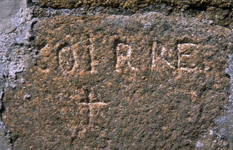 Façade est du moulin, détail d'une pierre de taille d'encadrement de la porte d'entrée ; il s'agit du nom d'un ancien meunier : Coirre.Immatriculation