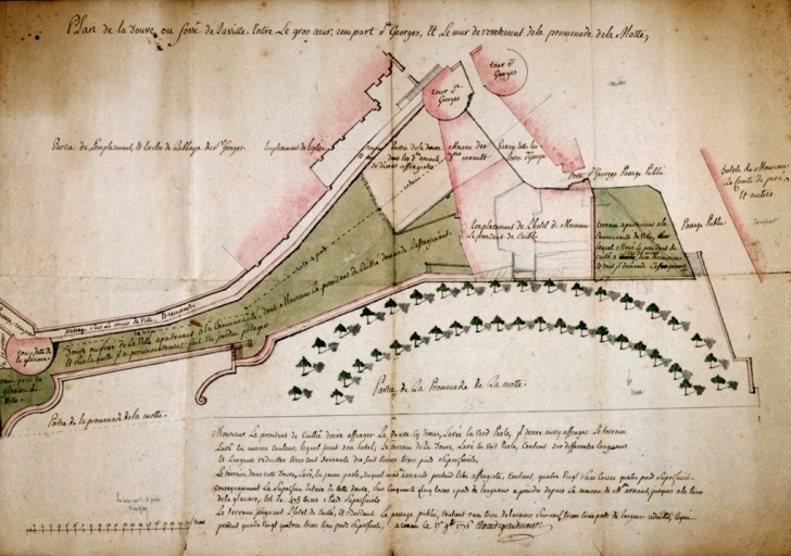 Plan de la douve ou fossé de la ville entre le gros mur, rempart Saint-Georges et le mur de revêtement de la promenade de la Motte, dessin par Chocat de Grandmaison, 1776 (A. C. Rennes, 1 FI 132)Immatriculation