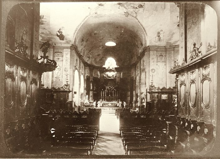 Chapelle, vue intérieure prise de l'ouest, vers 1960. Collection particulière.Immatriculation