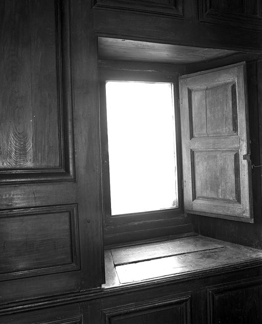 Pavillon sud, premier étage, pièce : lambris et fenêtre nord.Immatriculation