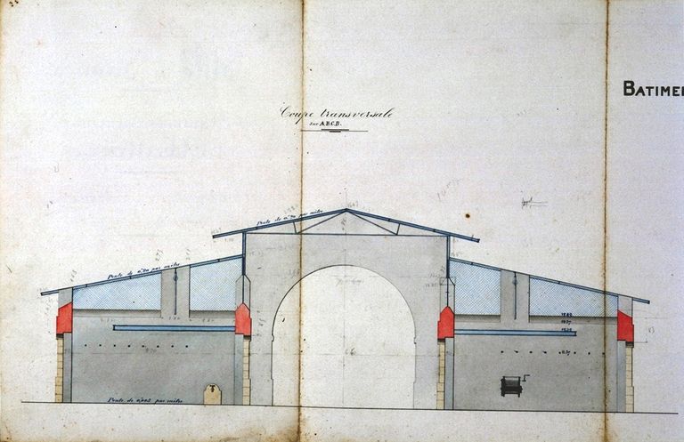 Agrandissement de l'abattoir par Edmond Bassac, 1891. Construction d'un bâtiment pour l'échaudoir. Coupe transversale. AM Vannes 1M197.Immatriculation