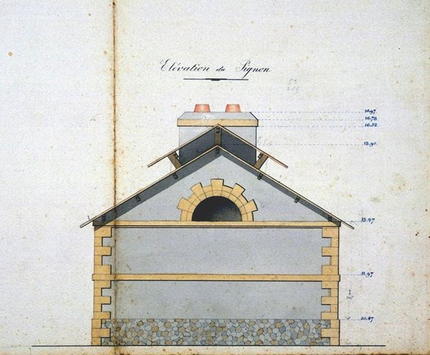 Agrandissement de l'abattoir par Edmond Bassac, 1891. Construction d'un bâtiment pour l'échaudoir. Elévation. AM Vannes 1M197.Immatriculation