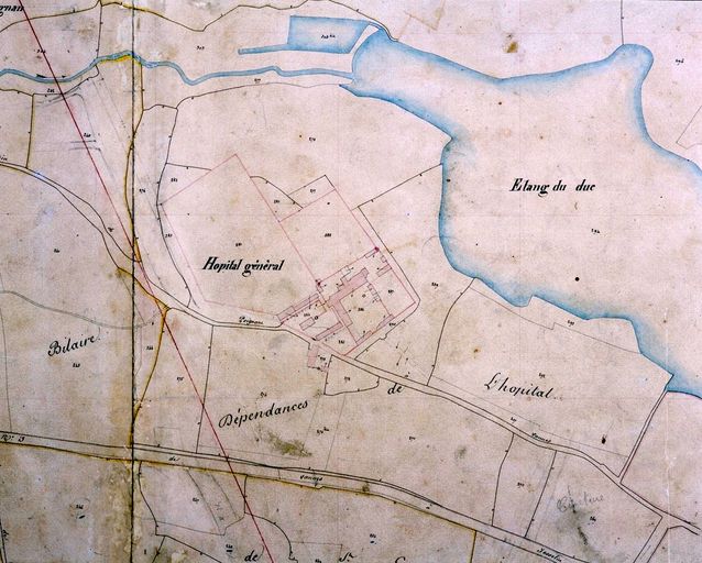 Plan cadastral de 1844 : feuille B2, partie nord de la route et hôpital général. AM Vannes 21Fi.Immatriculation