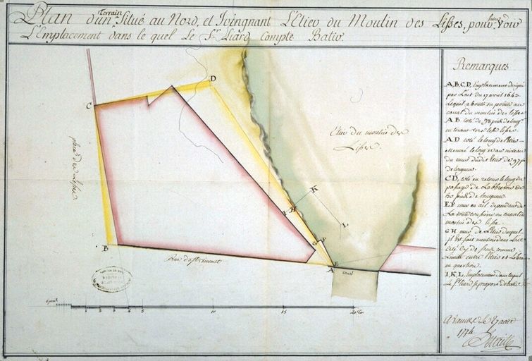 Fonds de l'Intendance. 1774. Plan d'un terrain...joignant le moulin des Lisses pour faire voir l'emplacement sur lequel le sieur Liard désire construire. AD Ille-et-Vilaine C704/25.Immatriculation