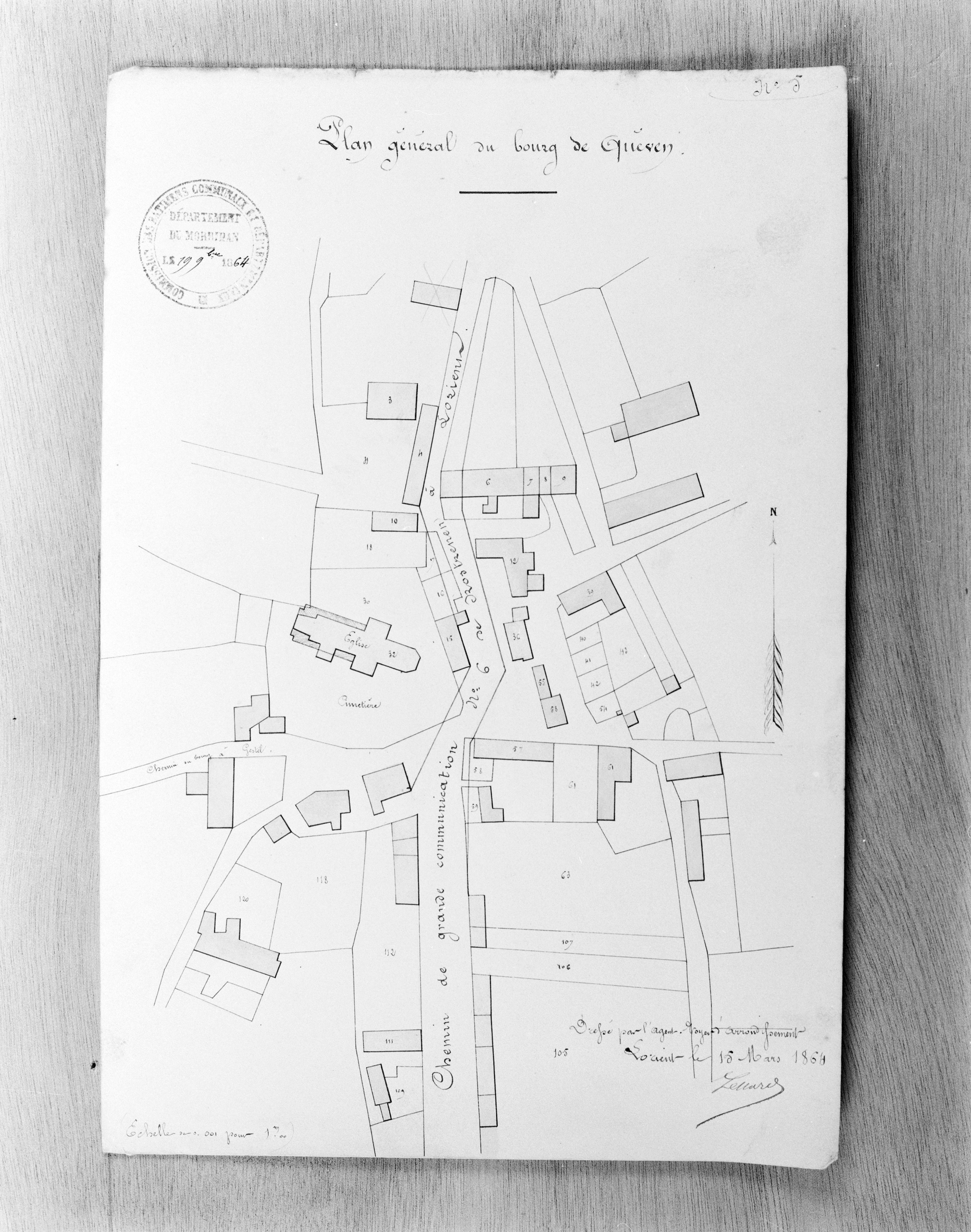 Projet de reconstruction partielle de l'église paroissiale dressé par l'agent-voyer d'arrondissement Lassart en 1864 : plan général du bourg de Quéven.Immatriculation