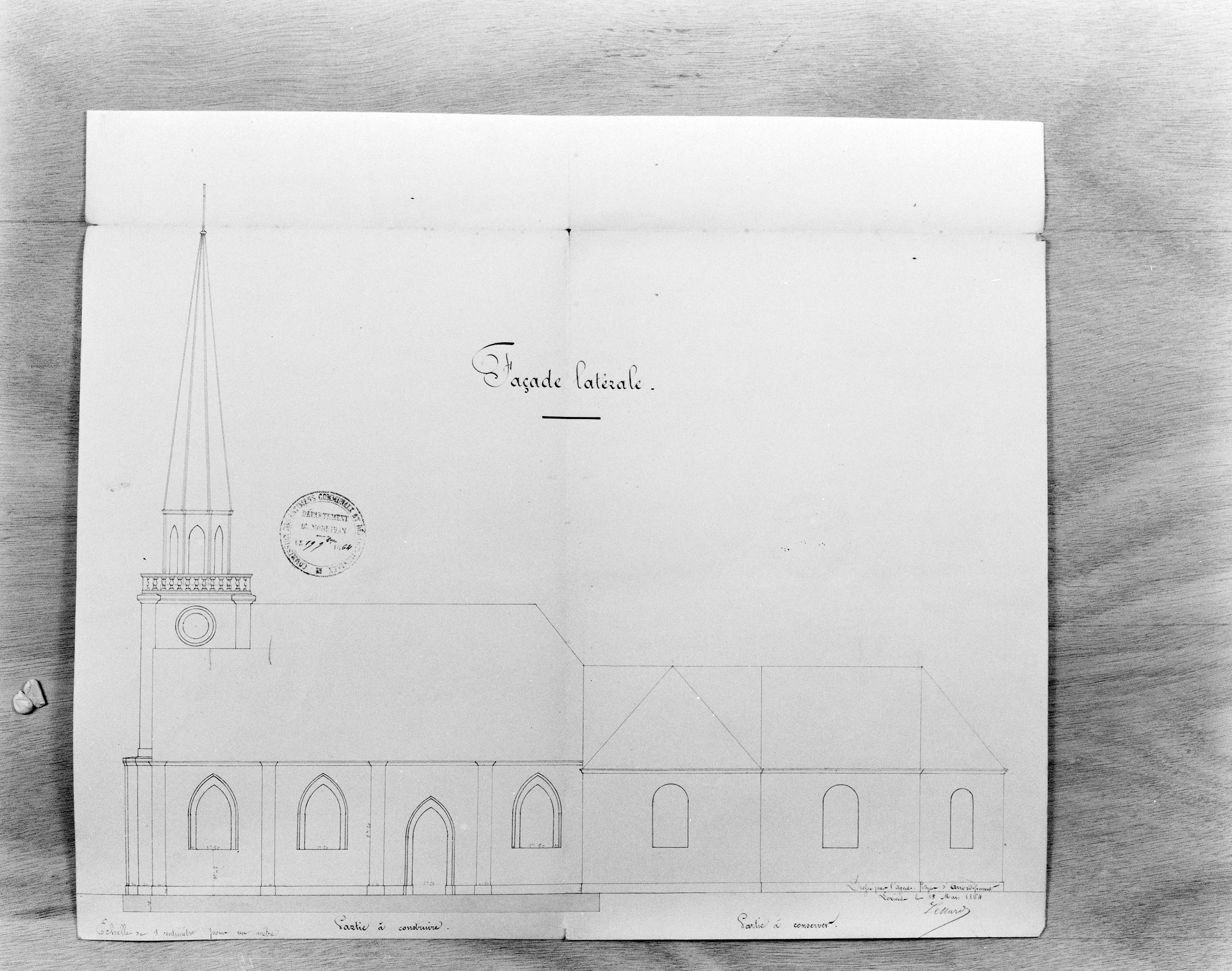 Projet de reconstruction partielle de l'église paroissiale. Façade latérale de l'église, 1864.Immatriculation