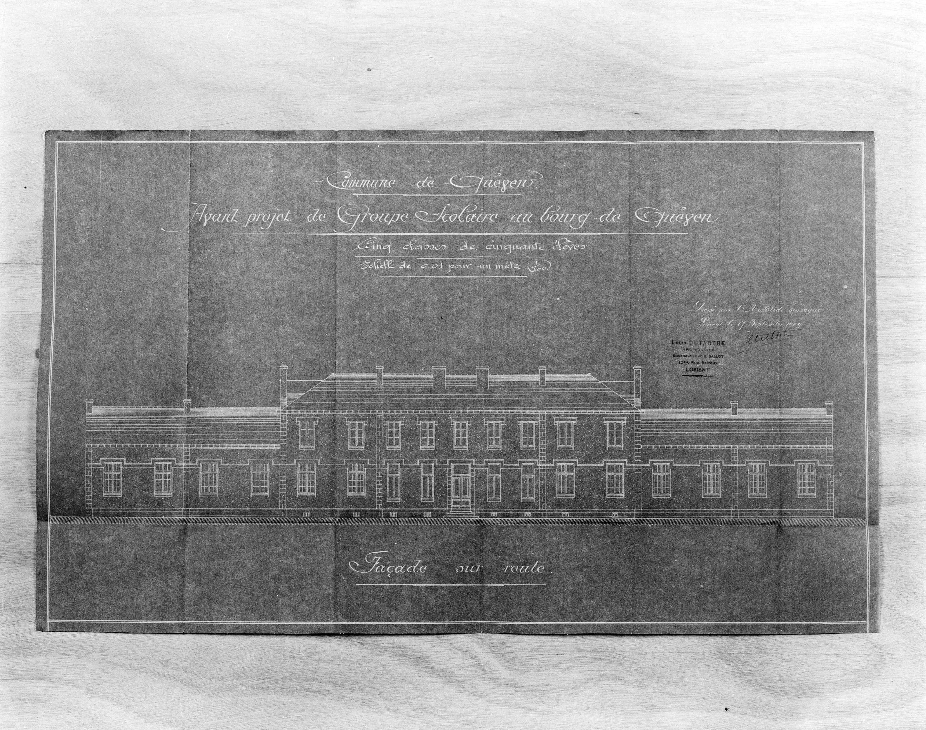 Avant-projet du groupe scolaire au bourg de Quéven, rue Jean Jaurès, dressé par l'architecte soussigné Louis Dutartre, Lorient le 17 septembre 1909 : façade sur route.Immatriculation