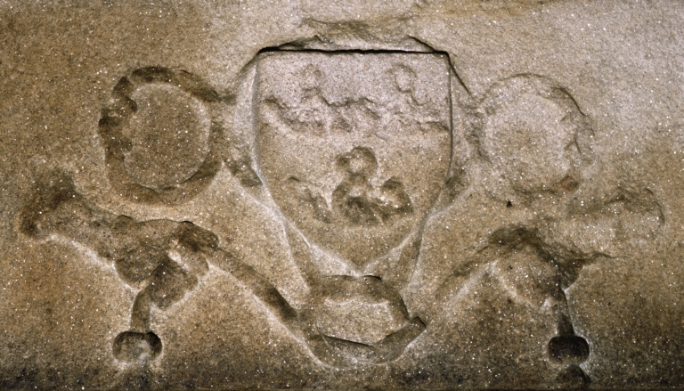 Cheminée de la salle, écu aux armes HuchetImmatriculation