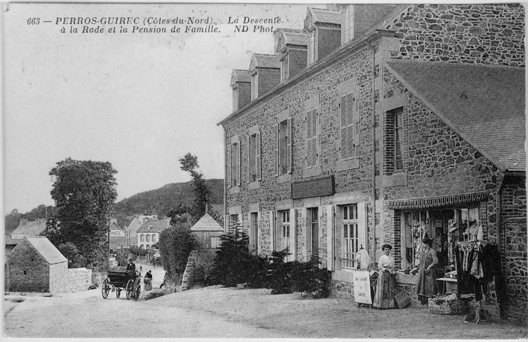 Perros-Guirec, la descente à la rade et la pension de famille, carte postale par N.D. éditeur, 1er quart 20e siècle.Immatriculation