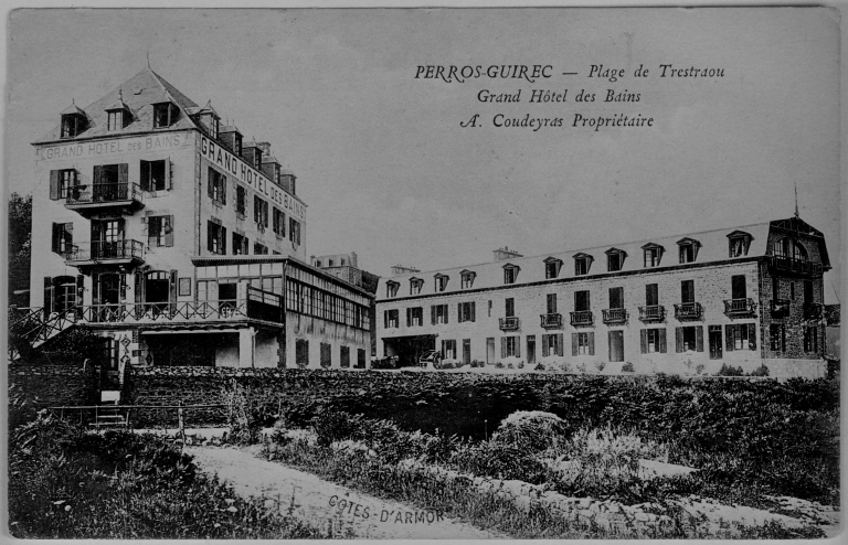 Perros-Guirec, la plage de Trestraou, Grand hôtel des Bains, A. Coudeyras propriétaire, carte postale, s.n., 1er quart 20e siècle.Immatriculation
