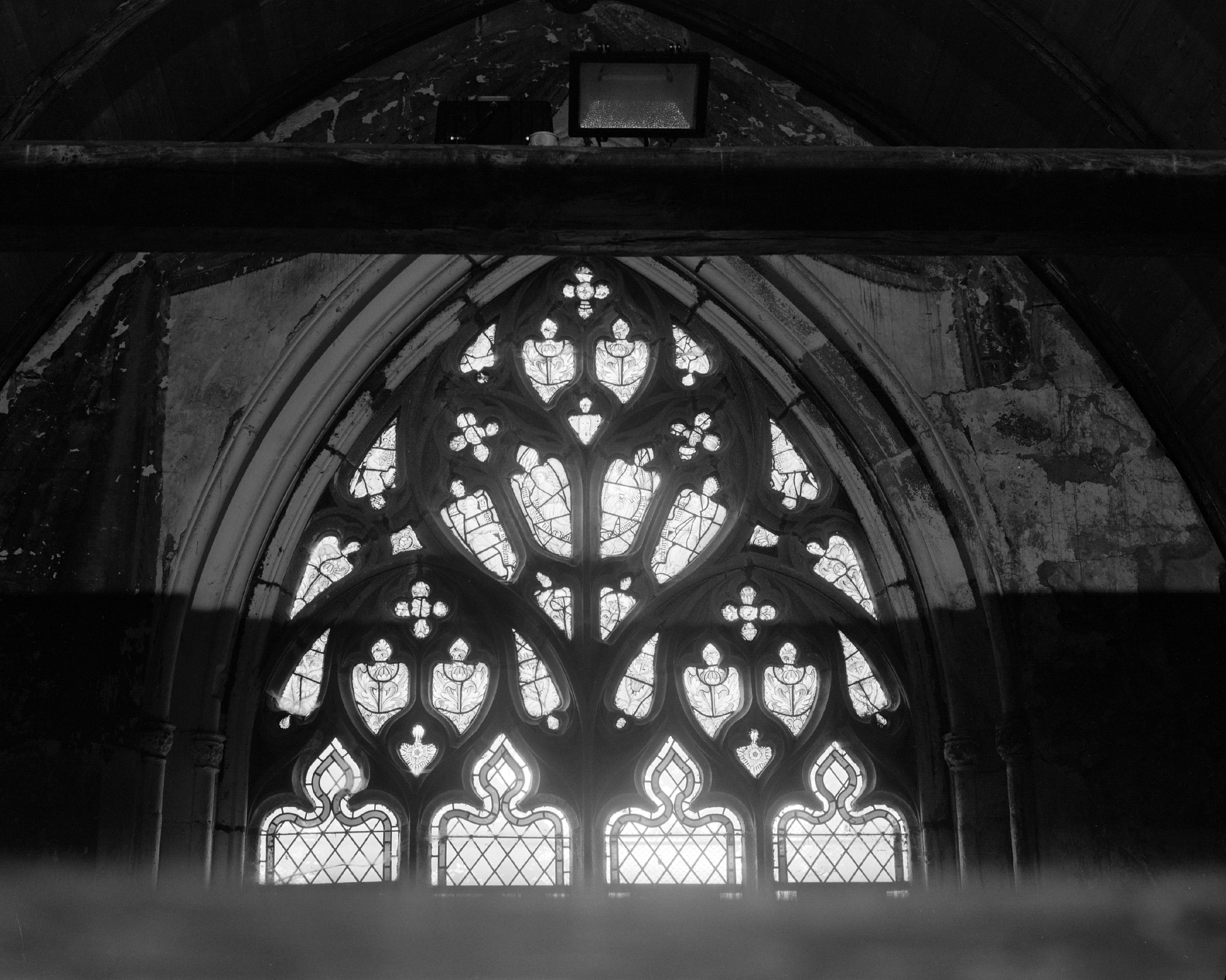 Ploubezre, chapelle de Kerfons : vue intérieure, détail de la maîtresse-vitre du chevet renfermant des panneaux anciens du 15e siècleImmatriculation