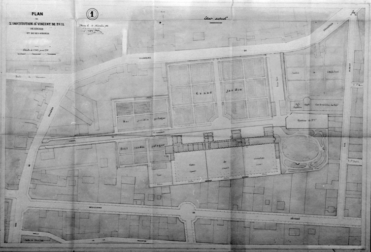 Plan de l'institution Saint-Vincent de Paul de Rennes et de ses abords, dessin, par Leray, 1912 (A. C. Rennes).Immatriculation