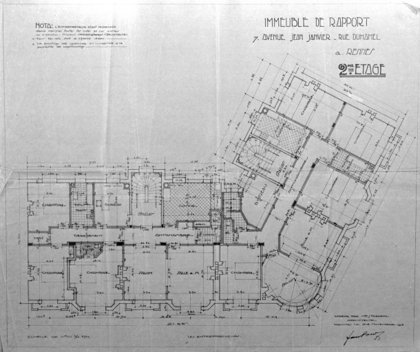 Immeuble de rapport, plan du 2e étage, dessin par Jean Poirier, 1928 (A. C. Rennes).Immatriculation