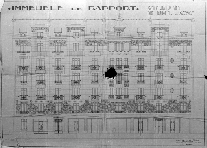 Immeuble de rapport, élévation, dessin par Jean Poirier, 1928 (A. C. Rennes).Immatriculation