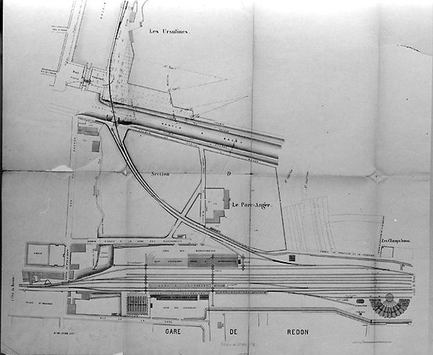 Redon. Projets d'embranchement pour le bassin à flots. Plan, par Clerc, [vers 1880]. Papier, encre, aquarelle ; échelle : 1 : 1000 et 1 : 200. (Archives privées SNCF : Rennes).