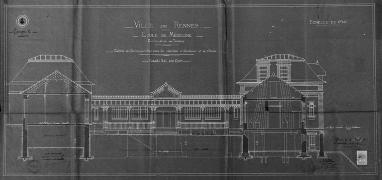 École de Médecine. Galerie de communication entre les services d'anatomie et de chimie, façade est sur cour. Dessin, par Emmanuel Le Ray, 1906 (A.C.Rennes)Immatriculation