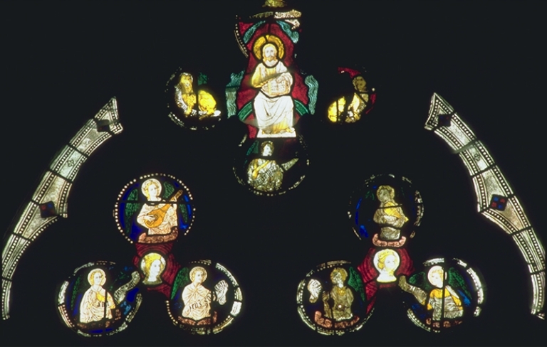 Verrière de la baie 8 (verrière décorative) : Le Christ et le tétramorphe, anges musiciens et portant des phylactères,