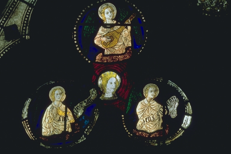 Verrière de la baie 8 (verrière décorative) : Le Christ et le tétramorphe, anges musiciens et portant des phylactères,