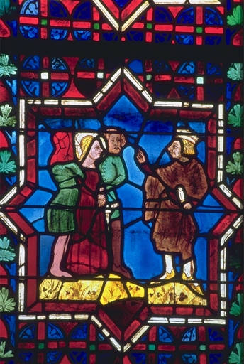Verrière de la baie 100 (verrière légendaire) : Jugement dernier, Vie du Christ, Histoire d'Abraham, Vie de sainte Catherine, Vie de sainte Marguerite, évocation des évêques de Dol,